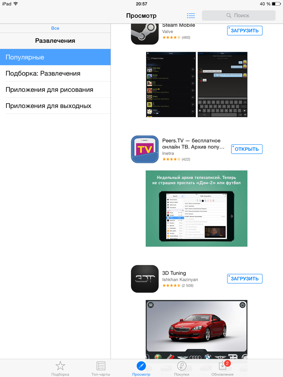 AppStore добавил в магазин новый раздел - "Просмотр" - для поиска самых рекомендованных и популярных приложений. Приложение Peers.TV добавили в популярное в категории "Развлечения".