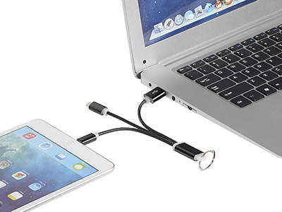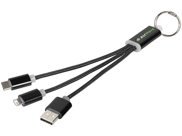 Кабель для зарядки Metal «3-в-1» с брелоком. Кабель для зарядки Metal «3-в-1» с брелоком. Кабель для зарядки Metal «3-в-1» с брелоком, коннекторами 1 type с, 1 USB type A и двойным совместимым коннектором «2-в-1» для устройств с ОС Apple® iOS и Android. В комплект входит брелок. Для зарядки устройств Apple подключайте кабель стороной без контактов; для зарядки устройств с ОС Android подключайте кабель стороной с контактами. Алюминий. Гравировка (Без чернения) на данный товар осуществляется бесплатно. Оплачивается только настройка оборудования в размере 500 рублей на весь тираж.