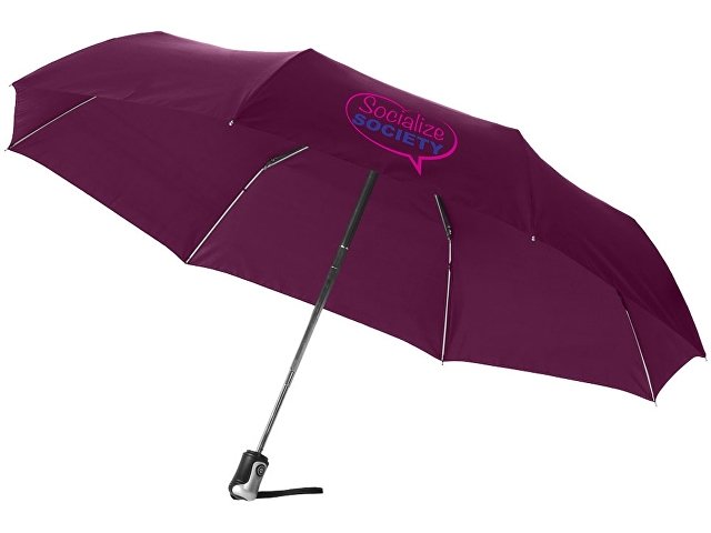 Зонт Alex трехсекционный автоматический 21,5". Зонт трехсекционный 21,5" с кнопкой автоматического включения и выключения. Металлический корпус и спицы и пластиковая ручка. В комплекте чехол. Полиэстер. Трафаретная печать (1 цвет (цветные изделия)) на данный товар осуществляется бесплатно. Оплачивается только настройка оборудования в размере 3800 рублей на весь тираж.