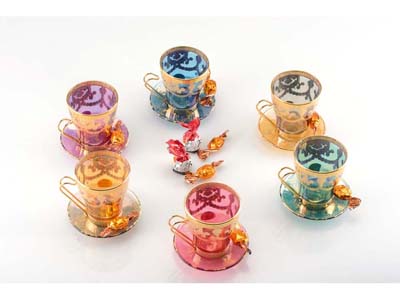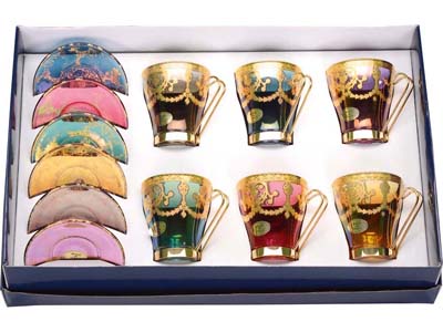 Прекрасный способ украсить обычное чаепитие! Набор для чая, рассчитанный на 6 персон, включает в себя разноцветные чашки и блюдца из стекла. На поверхность чашек и блюдец нанесен золотистый узор. Шильд спектрум (Шильд спектрум) на данный товар осуществляется бесплатно. Оплачивается только настройка оборудования в размере 500 рублей на весь тираж.