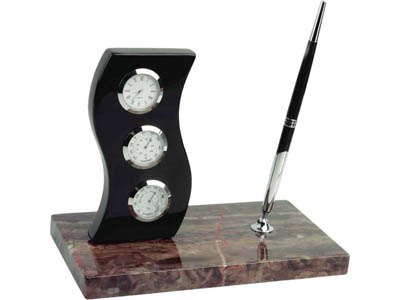 Замечательный прибор станет центральной фигурой рабочего стола руководителя. Настольный прибор оснащен держателем для ручки, часами и небольшой метеостанцией. Удачное сочетание цветов и фактур не оставит равнодушным даже самых притязательных. Гравировка (Без чернения) на данный товар осуществляется бесплатно. Оплачивается только настройка оборудования в размере 500 рублей на весь тираж.