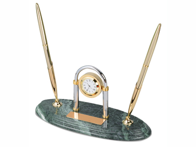 Настольный прибор «Стратегия»: часы, ручка шариковая- 2шт. Стильный настольный прибор с часами выполнен на мраморной подставке. Набор оснащен двумя держателями для ручек. Благодаря набору можно удобно организовать рабочее пространство и добавить изюминку в интерьер кабинета. Гравировка (Без чернения) на данный товар осуществляется бесплатно. Оплачивается только настройка оборудования в размере 500 рублей на весь тираж.