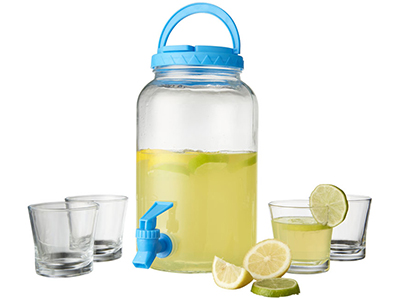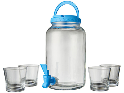 Набор для напитков Festi из 5 предметов. Стеклянный диспенсер для холодных напитков. Большое отверстие с закручивающейся крышкой для легкой чистки и наполнения. Обем 3 л. В комплекте 4 стакана по 200 мл. Набор идеален для вечеринок, пикников или для использования в офисе. Упакован в коробку Avenue. Стекло.