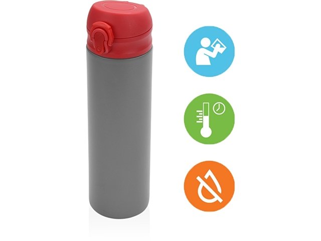 Термокружка «Хот» объемом 470 мл имеет двухстенную конструкцию из нержавеющей стали и крышку из пластика. Она сохранит температуру любого вашего напитка в течение 6 часов. Крышка надежно фиксируется с помощью кнопки. Также емкость для питья оснащена специальной мягкой удобной поилкой, которая не даст напитку пролиться. Благодаря своей универсальности термокружку можно использовать, как в офисе, так и дома. Гравировка (Без чернения) на данный товар осуществляется бесплатно. Оплачивается только настройка оборудования в размере 500 рублей на весь тираж.