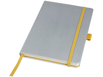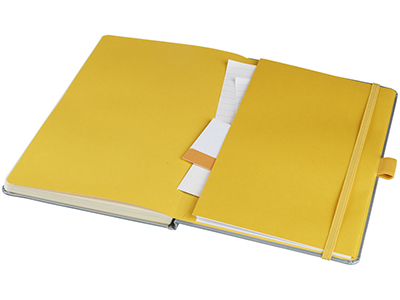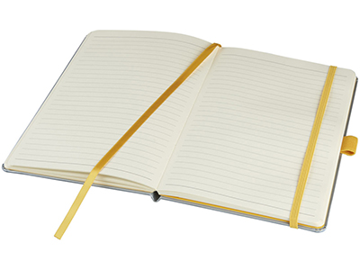 Цветной блокнот Melya. Стильный блокнот (размер А5 для ориентации) для креативных профессионалов, чтобы делать заметки, наброски или рисовать. Обложка различных цветов с эластичной застежкой в цвет и закладкой придает блокноту особый, свежий вид. 40 листов кремовой линованной бумаги (80 г/м2) и 40 листов чистой бумаги (80 г/м2) с кармашком для заметок и бумаг. Упакован в коробку-рукав. Бумага в виде кожзаменителя. Тиснение (Блинт) на данный товар осуществляется бесплатно. Оплачивается только настройка оборудования в размере 3000 рублей на весь тираж.