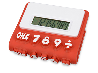 Гибкий калькулятор Splitz. Гибкий 8-разрядный калькулятор с белой отделкой, рельефными клавишами и функцией памяти. Батарейка включена в комплект. Силикон. Тампопечать (1 цвет (белые изделия)) на данный товар осуществляется бесплатно. Оплачивается только настройка оборудования в размере 2300 рублей на весь тираж.