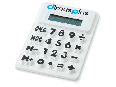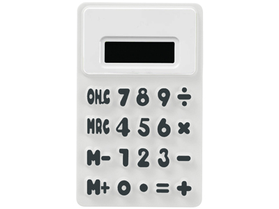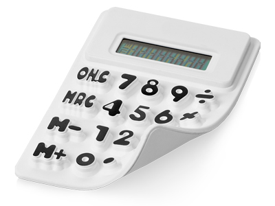 Гибкий калькулятор Splitz. Гибкий 8-разрядный калькулятор с белой отделкой, рельефными клавишами и функцией памяти. Батарейка включена в комплект. Силикон. Тампопечать (1 цвет (белые изделия)) на данный товар осуществляется бесплатно. Оплачивается только настройка оборудования в размере 2300 рублей на весь тираж.