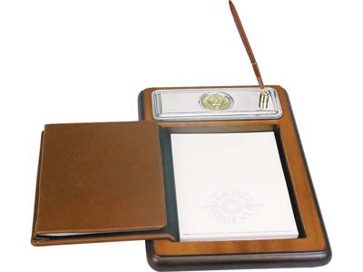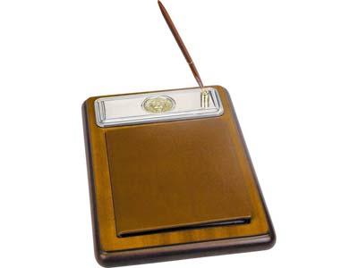Luigi Pesaresi – один из ведущих итальянских дизайнеров, все изделия которого выполнены с безупречным вкусом. Настольный набор и аксессуары сделаны из ценных пород дерева, кожи теленка и серебра. На каждой серебряной накладке факсимильная подпись основателя бренда. Набор выглядит не просто презентабельно, он выглядит величественно. Тиснение (Блинт) на данный товар осуществляется бесплатно. Оплачивается только настройка оборудования в размере 3000 рублей на весь тираж.