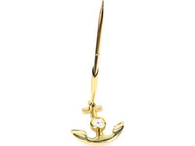 Небольшой настольный прибор в форме якоря оборудован подставкой для ручки и часами. Прибор сделан из латуни и обладает стильной золотистой расцветкой. Прибор идеально подойдет в качестве подарка представителям судоходных компаний, а также любителям рыбалки и моря. Гравировка (Без чернения) на данный товар осуществляется бесплатно. Оплачивается только настройка оборудования в размере 500 рублей на весь тираж.