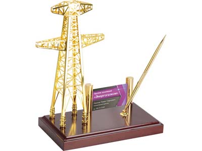 Настольный прибор со статуэткой вышки высокого напряжения станет необычным и полезным подарком представителям энергетических организаций. На приборе предусмотрены держатели для визиток и шариковой ручки. Гравировка (Без чернения) на данный товар осуществляется бесплатно. Оплачивается только настройка оборудования в размере 500 рублей на весь тираж.