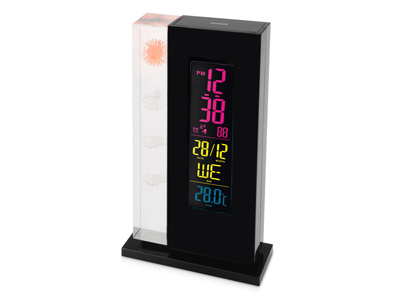 Метеостанция «Темпо» с цветным ЖК-дисплеем привлечет внимание к вашему логотипу благодаря своему необычному дизайну. На экране метеостанции отображается дата, время и температура в помещении, в котором она установлена. На прозрачной панели возле экрана высвечиваются пиктограммы, обозначающие прогноз погоды на ближайшее время: ясно, переменная облачность, пасмурно, дождь. Кроме того, метеостанция оборудована будильником. Может работать на батарейках (необходимо приобрести отдельно) или от адаптера переменного тока (входит в комплект). Тампопечать (1 цвет (цветные изделия)) на данный товар осуществляется бесплатно. Оплачивается только настройка оборудования в размере 2300 рублей на весь тираж.