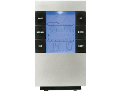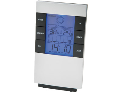 Настольная метеостанция с будильником с повторением сигнала, с указанием даты и дня недели, подсветкой, термометром в градусах по Цельсию и Фаренгейту, гигрометром и прогнозом погоды. Требуются 2 батарейки размера AAA (не включены в комплект). Пластик. Тампопечать (1 цвет (цветные изделия)) на данный товар осуществляется бесплатно. Оплачивается только настройка оборудования в размере 2300 рублей на весь тираж.