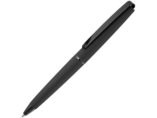 Металлическая шариковая ручка с мягким поворотным механизмом, матовым лакированным корпусом, длинным гибким металлическим клипом, декоративное кольцо и наконечник с глянцевой отделкой в черном цвете.
