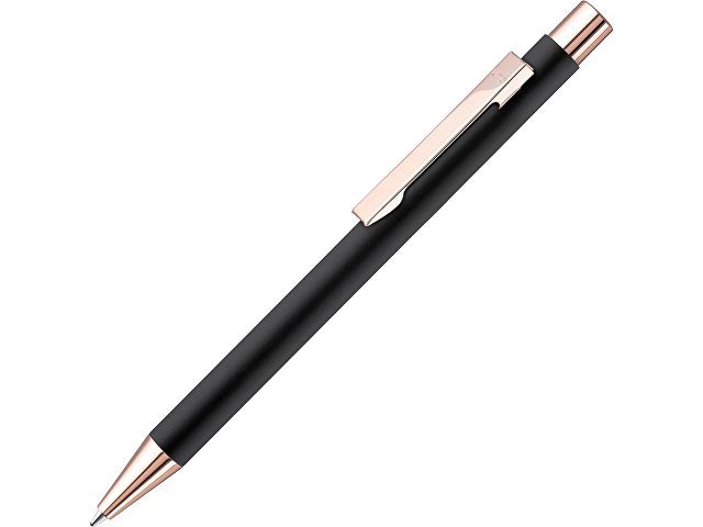 Металлическая шариковая ручка с мягким на ощупь корпусом в черном цвете, металлическим клипом, металлическим наконечником, кнопкой с глянцевой розово-золотой отделкой. Гравировка (Без чернения) на данный товар осуществляется бесплатно. Оплачивается только настройка оборудования в размере 500 рублей на весь тираж.