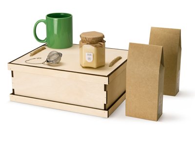 Набор состоит из кружки, баночки крем-мёда со вкусом ванили, двух видов чая (чёрный и зелёный) и ситечка для заварки. Набор упакован в деревянную коробку с бумажным наполнителем. Гравировка (Без чернения) на данный товар осуществляется бесплатно. Оплачивается только настройка оборудования в размере 500 рублей на весь тираж.