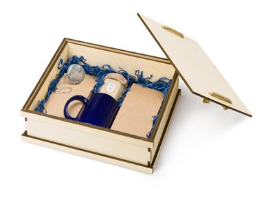 Набор состоит из кружки, баночки крем-мёда со вкусом ванили, двух видов чая (чёрный и зелёный) и ситечка для заварки. Набор упакован в деревянную коробку с бумажным наполнителем. Гравировка (Без чернения) на данный товар осуществляется бесплатно. Оплачивается только настройка оборудования в размере 500 рублей на весь тираж.