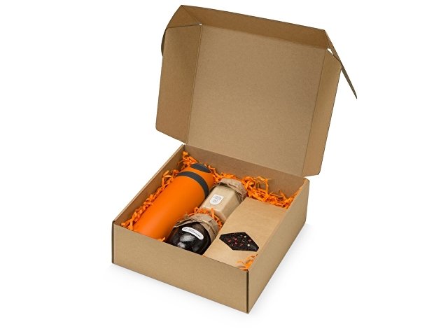 Набор состоит из термокружки, баночки крем-мёда с кокосом и миндалём, варенья из лесной черники, чёрного чая. Набор упакован в крафтовую картонную коробку с бумажным наполнителем. Трафаретная печать круговая (1 цвет (цветные изделия)) на данный товар осуществляется бесплатно. Оплачивается только настройка оборудования в размере 2300 рублей на весь тираж.