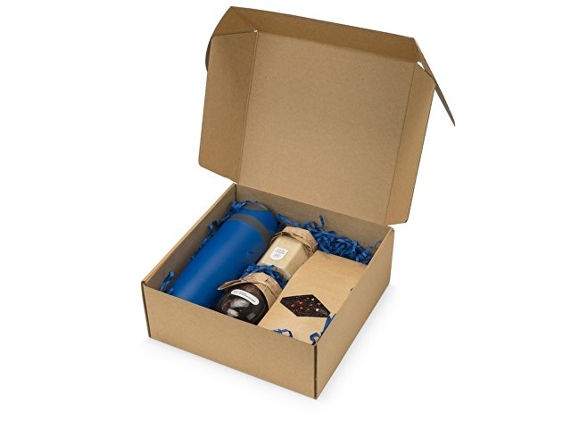 Набор состоит из термокружки, баночки крем-мёда с кокосом и миндалём, варенья из лесной черники, чёрного чая. Набор упакован в крафтовую картонную коробку с бумажным наполнителем. Трафаретная печать круговая (1 цвет (цветные изделия)) на данный товар осуществляется бесплатно. Оплачивается только настройка оборудования в размере 2300 рублей на весь тираж.