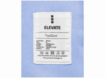 Рубашка с длинными рукавами Vaillant. Стандартный покрой. Белые пуговицы с гравировкой Elevate. Вторая петелька для пуговицы внизу с оранжевой строчкой. Манжеты с двумя пуговицами для регулирования размера. Рукав с разрезом на пуговицах. Принт лого сзади в тон изделия. Сатиновая вставка внутри горловины. Мужская модель с пуговицами на воротнике. Оксфорд, 100% хлопок. 40x32/2, 110x50. Трафаретная печать (1 цвет (цветные изделия)) на данный товар осуществляется бесплатно. Оплачивается только настройка оборудования в размере 3800 рублей на весь тираж.