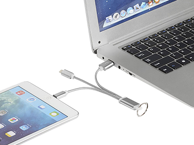 Кабель для зарядки Metal «3-в-1» с брелоком. Кабель для зарядки Metal «3-в-1» с брелоком. Кабель для зарядки Metal «3-в-1» с брелоком, коннекторами 1 type с, 1 USB type A и двойным совместимым коннектором «2-в-1» для устройств с ОС Apple® iOS и Android. В комплект входит брелок. Для зарядки устройств Apple подключайте кабель стороной без контактов; для зарядки устройств с ОС Android подключайте кабель стороной с контактами. Алюминий. Гравировка (Без чернения) на данный товар осуществляется бесплатно. Оплачивается только настройка оборудования в размере 500 рублей на весь тираж.