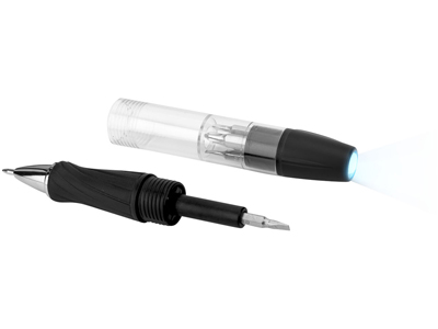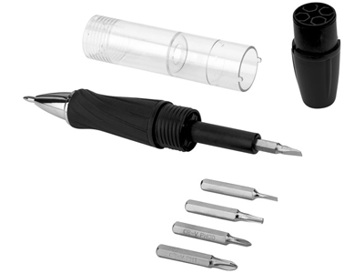 Инструмент King 7-ми функциональный с ручкой и фонариком. Шариковая ручка с поворотным механизмом, корпус- холдер для 5-ти насадок отверток. Светодиодный фонарик с поворотным включением. Батарейки в комплекте. АБС пластик. Тампопечать (1 цвет (цветные изделия)) на данный товар осуществляется бесплатно. Оплачивается только настройка оборудования в размере 2300 рублей на весь тираж.