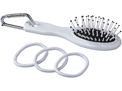Набор Jolie Расческа с резинками. Дорожная расческа небольшого размера, три резинки для волос и мини алюминиевый карабин. АБС пластик. Тампопечать (1 цвет (белые изделия)) на данный товар осуществляется бесплатно. Оплачивается только настройка оборудования в размере 2300 рублей на весь тираж.