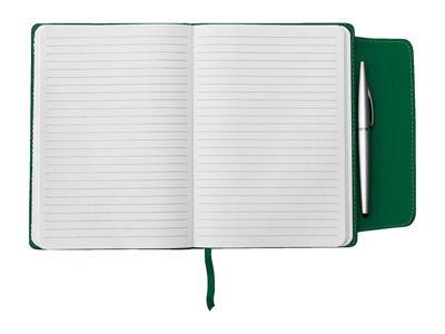 Блокнот формата А5 с магнитной застежкой. Включает пластиковую шариковую ручку-стилус и 80 листов белой линованной бумаги (70 г/м