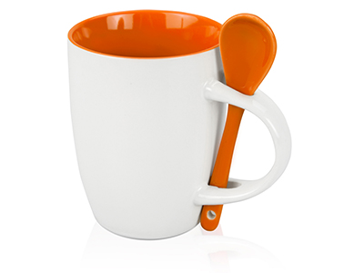 Стильная кружка на 320 мл с ложкой выполнены в контрастном сочетании цветов. Оригинальная форма ручки кружки позволяет крепить в ней ложку. Замечательный подарок для коллег по работе. Тампопечать (1 цвет (белые изделия)) на данный товар осуществляется бесплатно. Оплачивается только настройка оборудования в размере 2300 рублей на весь тираж.
