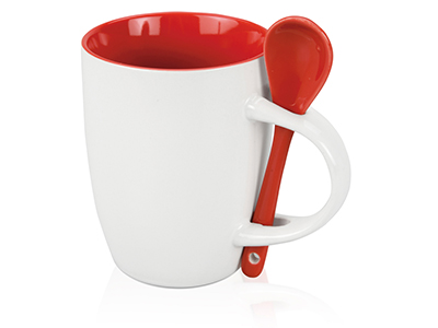 Стильная кружка на 320 мл с ложкой выполнены в контрастном сочетании цветов. Оригинальная форма ручки кружки позволяет крепить в ней ложку. Замечательный подарок для коллег по работе. Тампопечать (1 цвет (белые изделия)) на данный товар осуществляется бесплатно. Оплачивается только настройка оборудования в размере 2300 рублей на весь тираж.