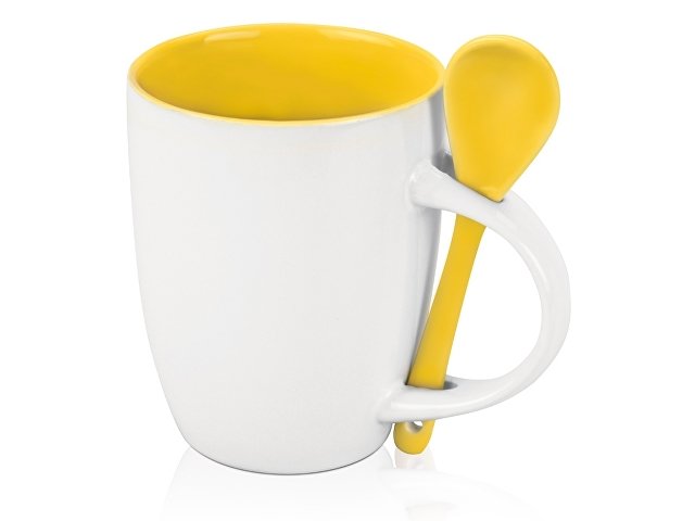 Стильная кружка на 320 мл с ложкой выполнены в контрастном сочетании цветов. Оригинальная форма ручки кружки позволяет крепить в ней ложку. Замечательный подарок для коллег по работе. Тампопечать (1 цвет (белые изделия)) на данный товар осуществляется бесплатно. Оплачивается только настройка оборудования в размере 2300 рублей на весь тираж.