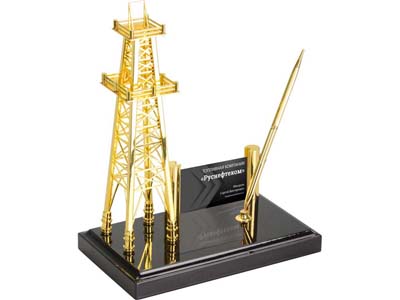 Настольный прибор с вышкой прекрасно подчеркнет специфику работы ресурсодобывающей компании. На приборе расположена визитница и подставка для шариковой ручки. Классическое сочетание черного и золотистого оттенков хорошо впишутся в интерьер. Гравировка (Без чернения) на данный товар осуществляется бесплатно. Оплачивается только настройка оборудования в размере 500 рублей на весь тираж.